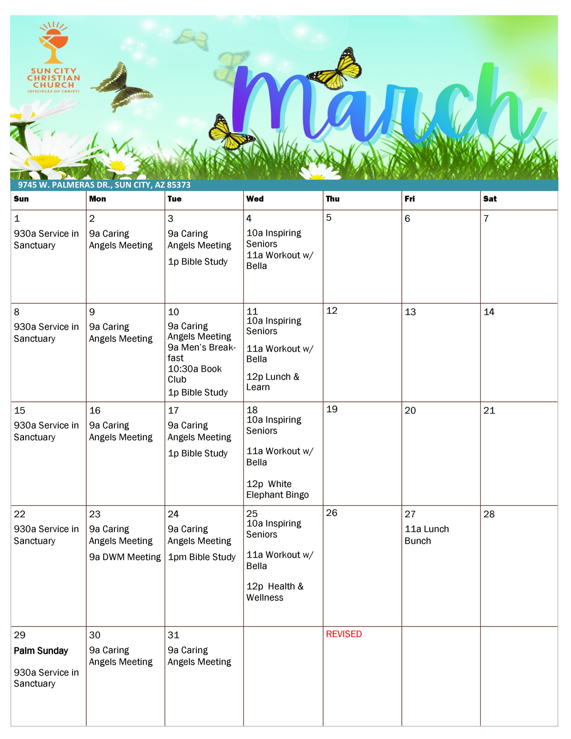 - Wednesday Workout📅 Every Wednesday🕒 Time: 11:00 am📍 Location: Sun City Christian Church You’re invited to the weekly Wednesday Workout at Sun City Christian Church every Wednesday at 11:00 am. Bella leads a 30-minute class for men and women at every level. We work on stretching,… Read more: Wednesday Workout